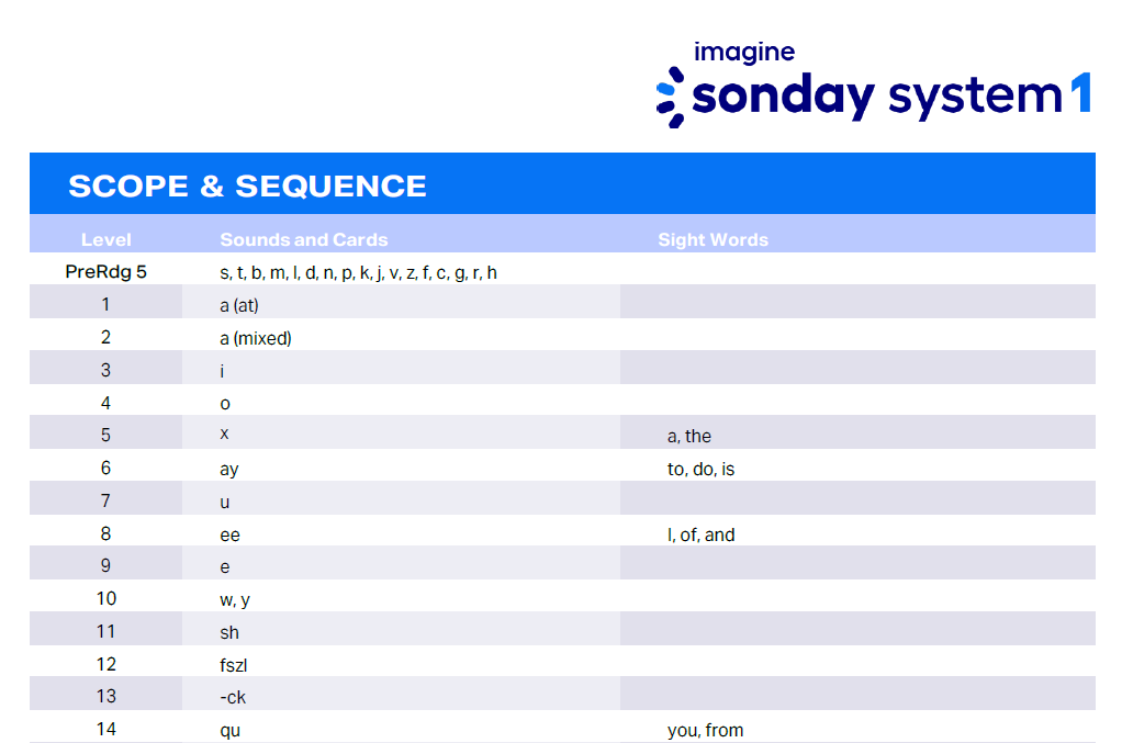 The Scope & Sequence document for Imagine Sonday System 1 (SS1) defines what is taught and in what order. It lists the sounds and cards (and sight words, when applicable) taught at every level in the program.